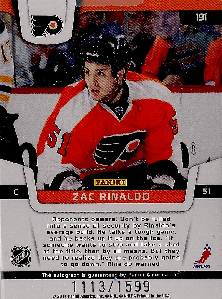 I got this in the mail yesterday. I am not a big Flyers fan but I was hoping they would go to the cup finals. Meh.. not all wishes come true lol. What I found interesting about this card was what was written on the back. In the last decade of card collecting, i have found very few reasons to flip the card over and read the liner notes. However for some reason, I chose to read this one. I got a great laugh and really appreciated the efforts of Panini to include this liner note. Take a read and enjoy! I surely did. Thumbs up Panini!!