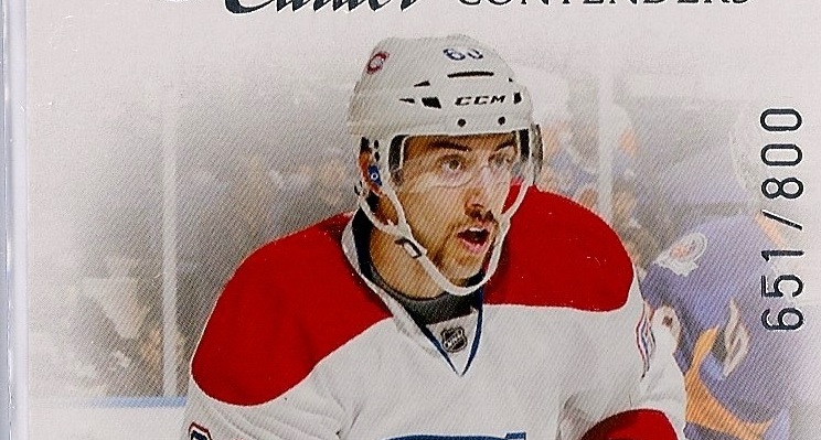 Hockey cards in general feature mostly action shots. This is such a high paced game, you rarely see “boring” shots. Score has the net cam shots as an example. The negative aspect of having an action shot is that you are prone to show photo’s of athletes that are quite comical. For instance, take a look at this Pulashaj image on the Panini Calder Contenders card. I wonder what was going through his head at the time of this shot.